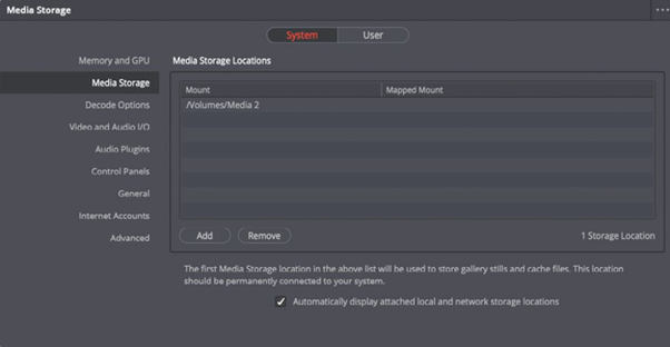 미디어 저장소 범주에서는 다빈치 리졸브(DaVinci Resolve)를 사용할 때 "스크래치 디스크"라고 하는 드라이브를 시스템에 추가할 수 있습니다. 프로젝트 기간 동안 다빈치 리졸브(DaVinci Resolve)에서는 하드 드라이브에 저장해야 하는 미디어를 생성하는 경우가 발생합니다. 여기에는 캐시되거나 렌더링된 파일, 스틸 프레임 및 재생 성능을 향상시키기 위해 최적화된 다양한 미디어가 포함될 수 있습니다. 해당 파일은 미디어 저장소 환경 설정에 나열된 첫 번째 하드 드라이브에 저장됩니다.